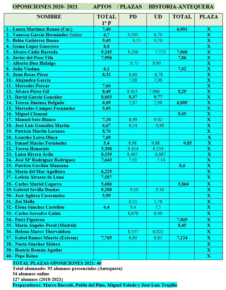Resultados de las oposiciones de Geografía e Historia en Andalucía en la convocatoria de 2021. Alumnos con plaza. Preparadores: José Luis (didáctica), Marco (Geografía), Pablo (Arte), Miguel (Historia), David (Historia).